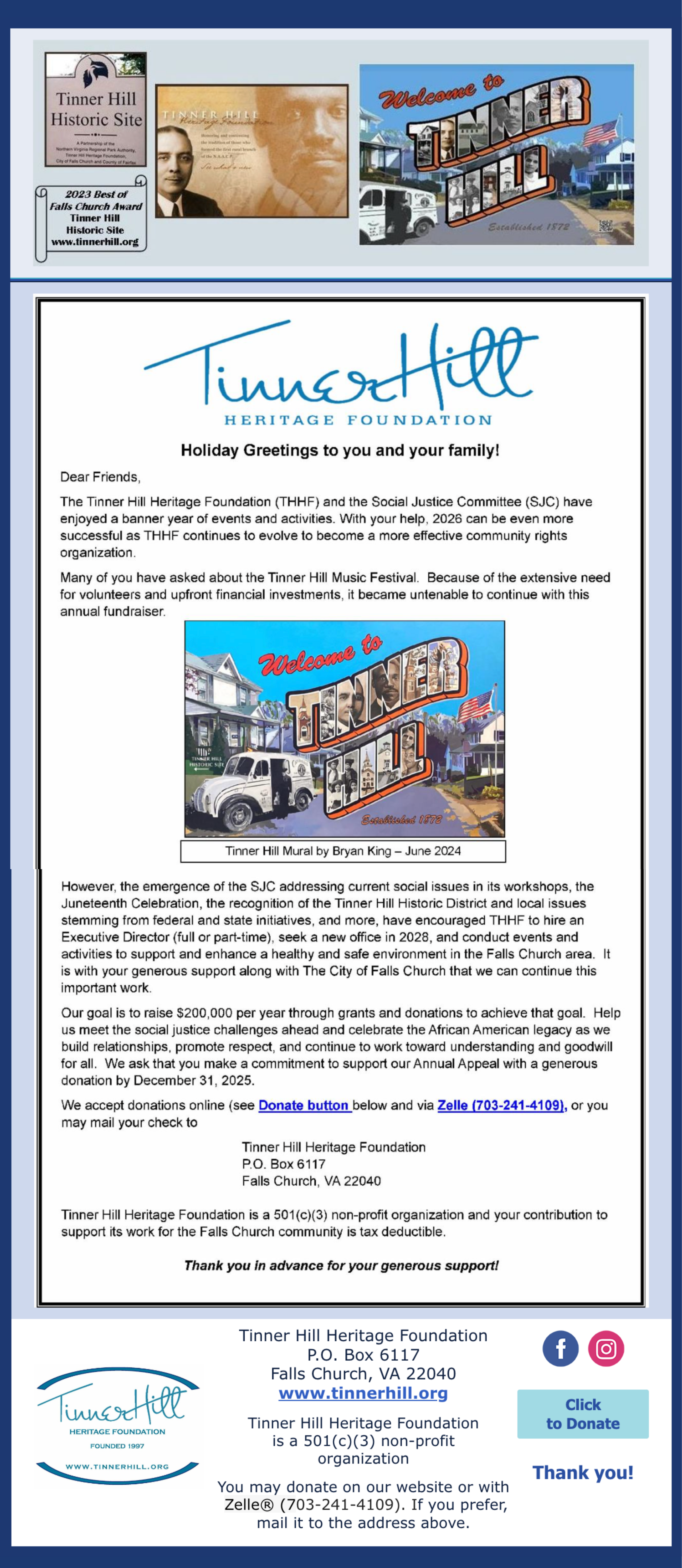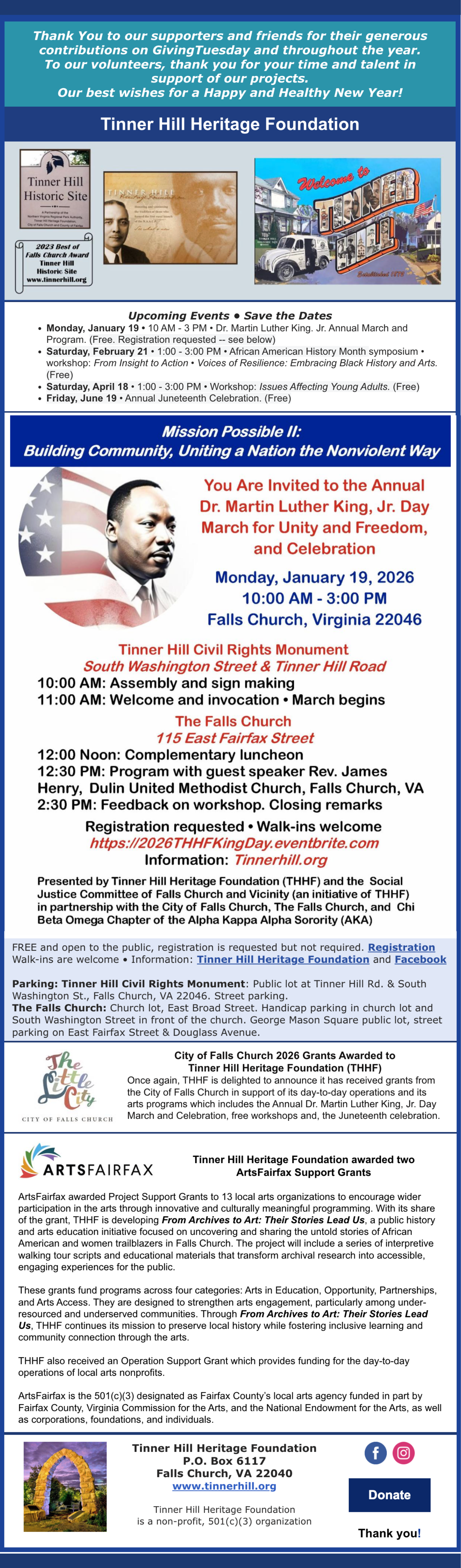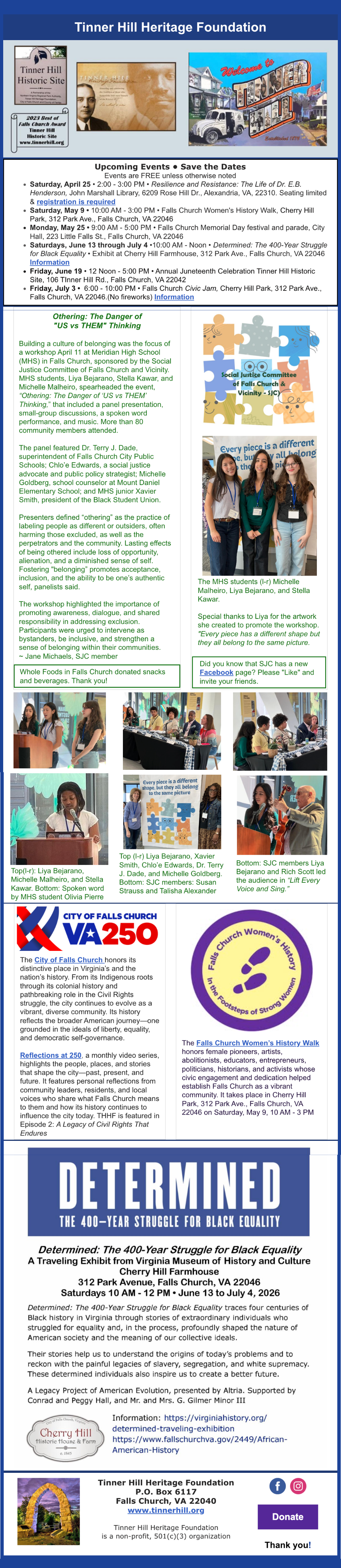 Today, we all reap the benefits of this almost forgotten battle. Up to the eighth generation of these families still live on Tinner Hill. The Tinner Hill Heritage Foundation has two, close-in-proximity properties that, remarkably, survive from the post-Civil War period. Both properties are intimately tied to the history of Falls Church and to the struggles of African Americans to attain their rights and freedoms, from the period of Jim Crow through the Civil Rights Movement.